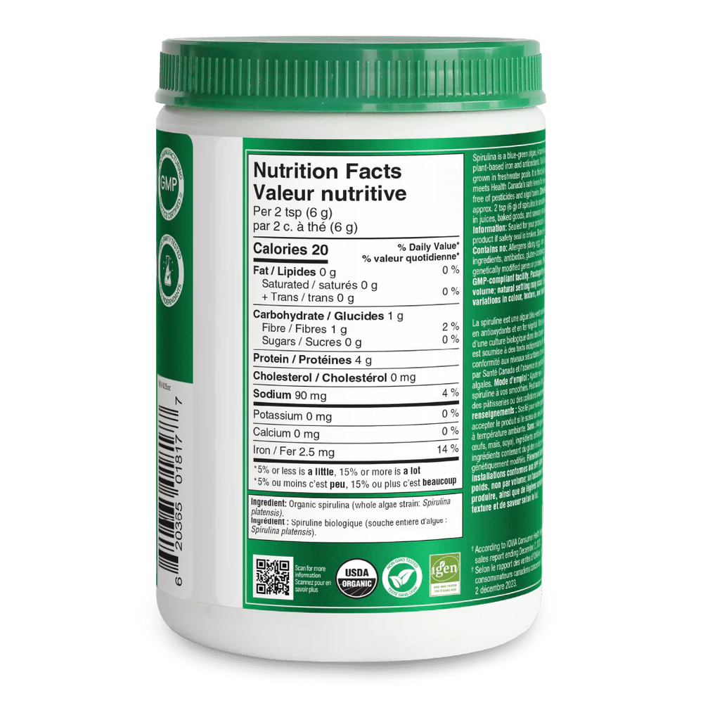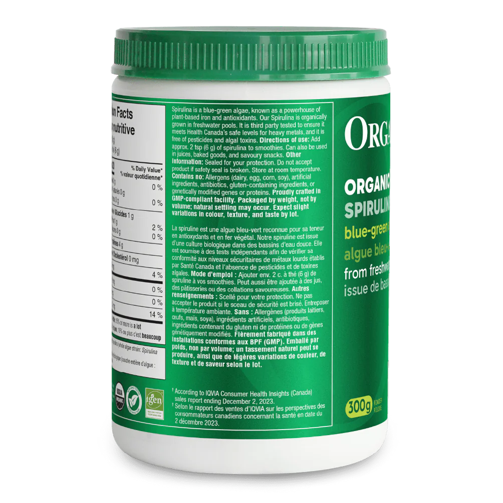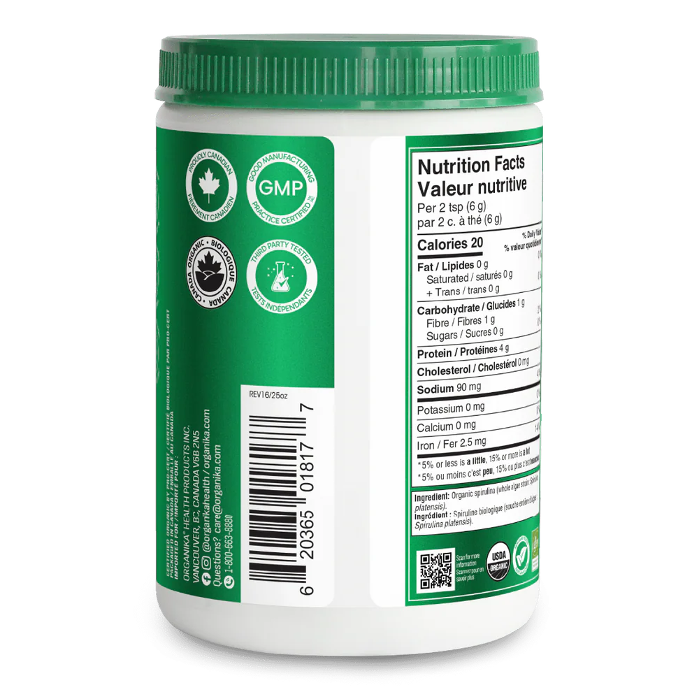 오가니카의 100% 순수 스피룰리나 파우더는 살충제, 화학 비료, 유해 제초제를 사용하지 않고 재배되었습니다. 유기농 인증을 받은 오가니카 스피룰리나는 아미노산, 엽록소, 효소, 미량 미네랄, 항산화제 등이 풍부하게 함유되어 있습니다. 이 녹색 슈퍼푸드는 물이나 주스, 또는 좋아하는 스무디에 넣어도 잘 어울립니다. 진하고 풍부한 녹색 스피룰리나 색상에 은은한 풍미가 더해졌습니다.