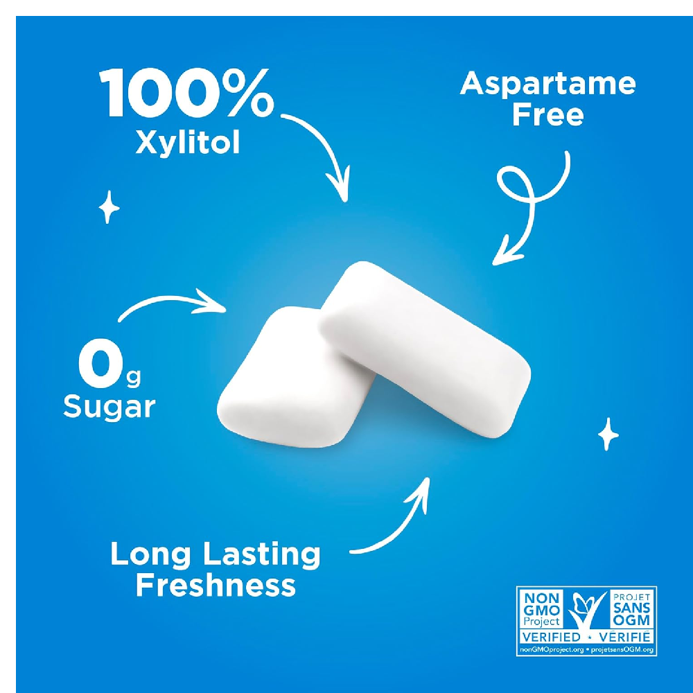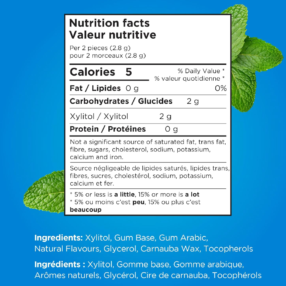 Ingredients: Xylitol, gum base, gum arabic, natural flavours, glycerol, carnauba wax, tocopherals.