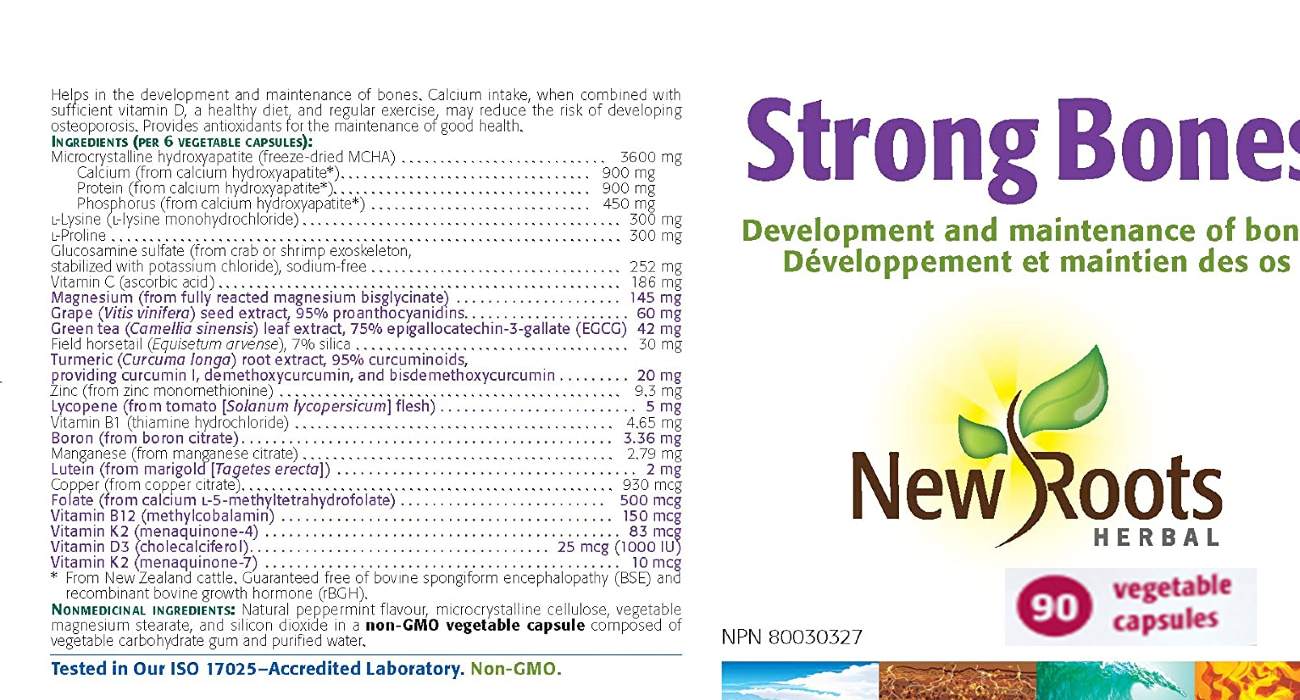 Strong Bones는 골다공증 예방을 위한 광범위한 효능을 가진 제품입니다. Strong Bones의 강력한 효능은 미정질 수산화인회석(MCHA)에서 시작됩니다. MCHA는 인체 보충제로 가장 쉽게 구할 수 있는 칼슘 형태이며, 단백질과 인이 풍부합니다. 이는 인체에서 발견되는 칼슘과 동일한 종류입니다. 저희 MCHA는 항생제, 제초제, 살충제, 광우병 검사를 통과한 뉴질랜드산 방목 소에서 추출한 것입니다. 최고 품질을 제공하기 위해 동결 건조되었습니다.