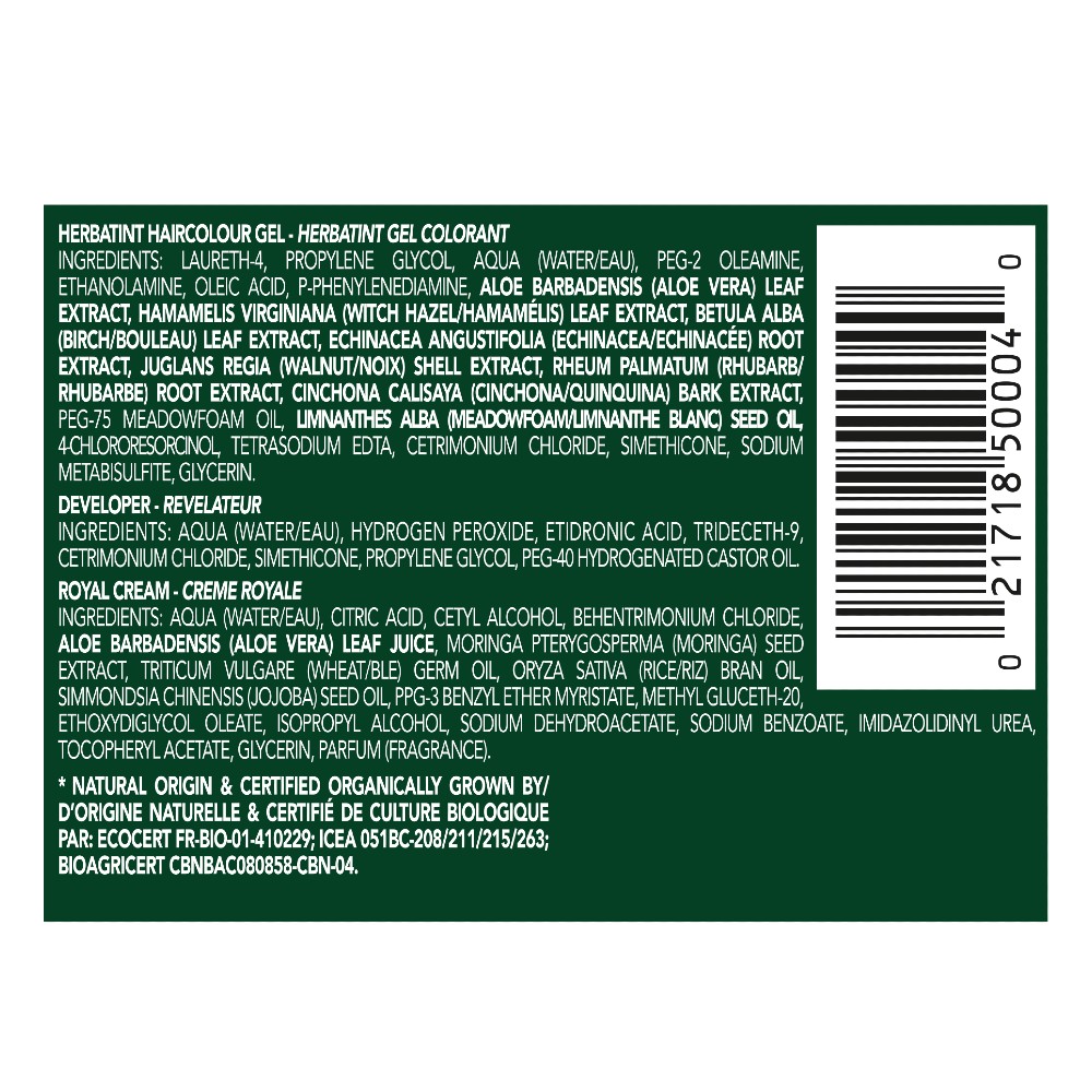 Pack contains 1 Herbatint Haircolour Gel 60ml, 1 Glycol Developer 60ml, 1 sample of either Royal Cream Conditioner or Shampoo 10ml, 1 pair gloves, 1 leaflet giving directions for use.Other Ingredients: Haircolor Gel: laureth-5, propylene glycol, aqua/water, PEG-2 oleamine, ethanolamine, walnut extract, rhubarb extract, cinchona extract, p-phenylenediamine, aloe barbadensis extract, 2 aminophenol 4 sulfonic acid, PEG-75 meadowfoam oil, echinacea augustifolia extract, betula alba leaf extract, hamamelis virginiana extract, sodium hydrosulfite, sodium ascorbate, tetrasodium edta, resorcinol, cetrimonium chloride, 2,4 diaminophenoxyethanol HCL. Glycol Developer: aqua/water, hydrogen peroxide, etidronic acid, cetrimonium chloride. Royal Cream conditioner: aqua/water, mallow extracts, rosemary extract, behentrimonium chloride, wheat bran lipids, fragrance.Warnings.This product contains ingredients which may cause skin irritation on certain individuals and a preliminary patch test, according to accompanying instructions should be made prior to each application.